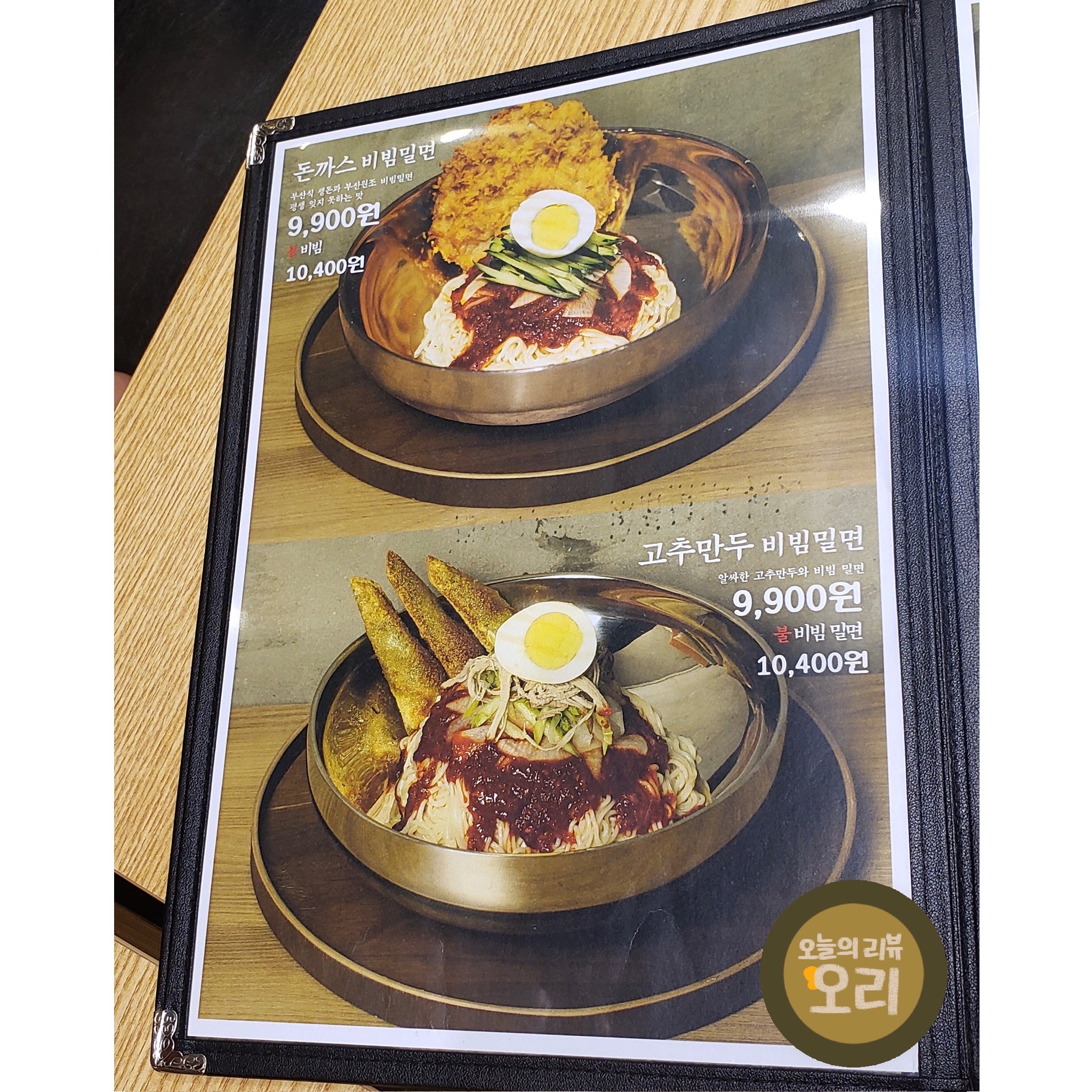 메뉴판의 메뉴가 많아 상당히 두꺼웠지만 저는 간단히 부산 원조 밀면과 고추만두 튀김을 주문했어요.