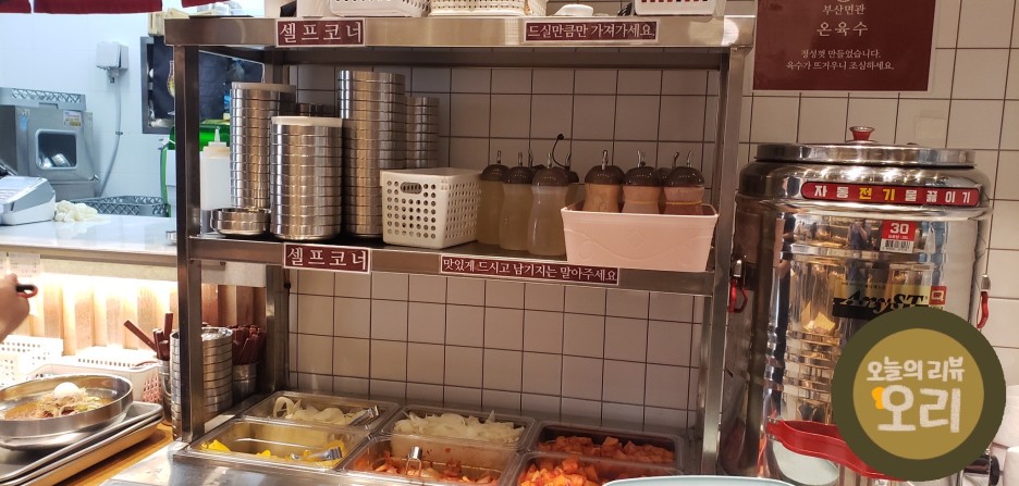 부산면관은 주문 음식 서빙을 제외한 모든 것이 셀프입니다. 그래서 그런지 사람이 몰릴 때는 셀프 이용 코너에 사람이 많이 있어 좁은 공간에서 기다려야 하니 조금은 불편하더라고요.