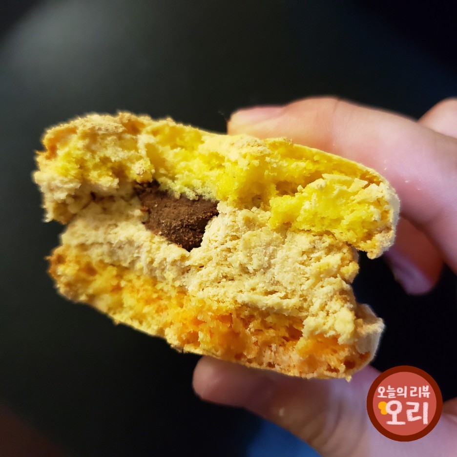 네 번째 마카롱은 '인절미 초코'입니다. 인절미 가루가 겉에 묻어있고 안에는 작은 초콜릿이 박혀있어요. 인절미의 맛이 강하진 않으나 그래도 맛있었습니다. 인절미 가루가 붙어있는 것이다 보니 손이나 탁자에 가루가 많이 떨어졌어요. 드실 때 참고해 주세요.