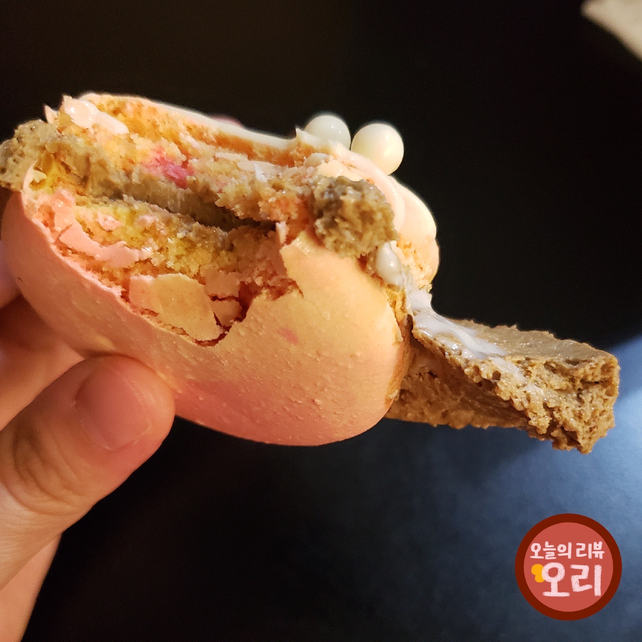 가장 처음 맛본 '얼그레이 밀크티'입니다. 조금 녹은 뒤 먹었더니 안의 필링이 저렇게 쏙 빠졌답니다. ㅋㅋ 뚱카롱이라 그런지 크기도 크고 필링의 양도 꽤 많았어요. 얼그레이를 원래도 좋아하는 저로서는 꽤나 마음에 들었습니다.