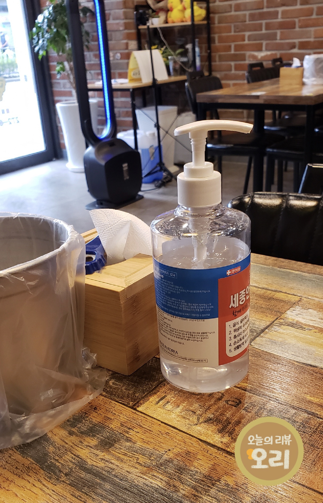 가게 안에는 커다란 소독 기기(?)가 있었어요. 발판을 밟으면 온몸에 소독약을 뿌려주더라고요. 모든 테이블 위에는 손 소독제가 있었어요. 테이블 위에를 만져봤을 때 끈적임이 전혀 없어서 좋았어요.