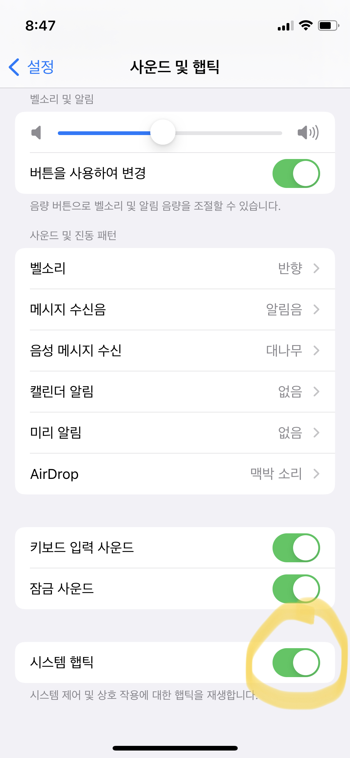 추가. 만약 모든 단계를 따라 했는데도 반응이 없다면, 설정 -> '진동' 검색 -> 사운드 및 진동 패턴 -> 제일 밑에 있는 '시스템 햅틱'을 켜주시면 돼요! (사진 슬라이드를 넘기면서 확인해 주세요!)