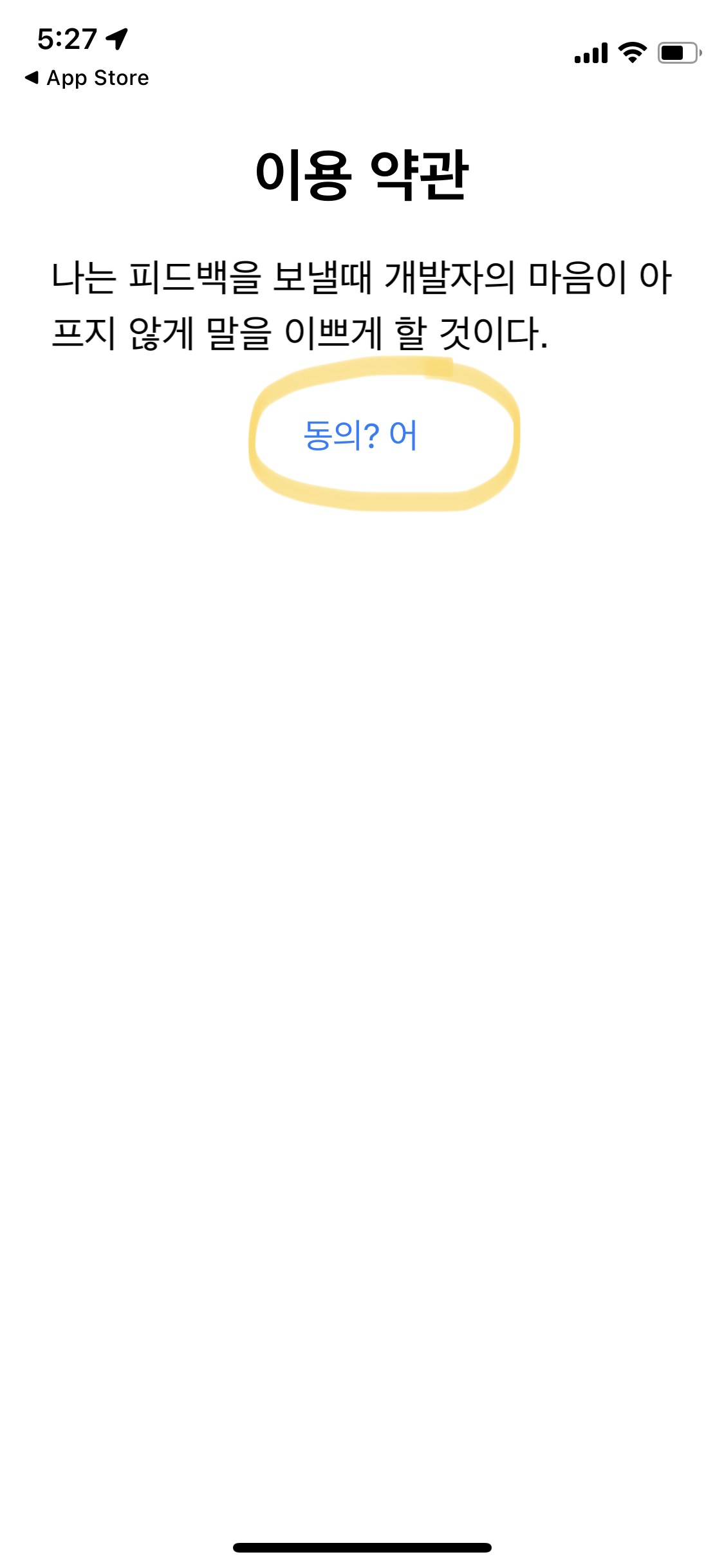 2. 앱을 다운로드한 후, 열게 되면 이렇게 어색한 한국어로 된 이용 약관이 나와요.