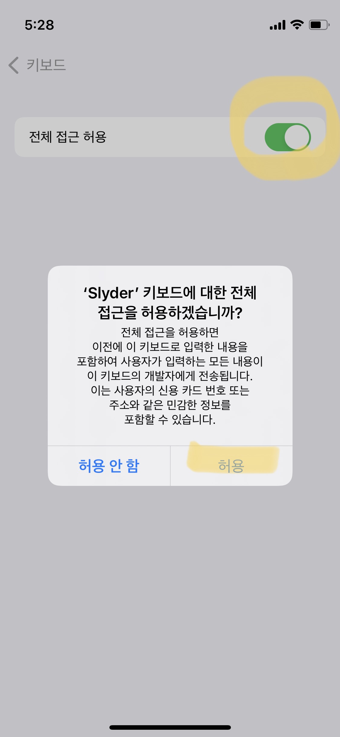 2. '전체 접근 허용'을 켜주시고, 키보드에 대한 전체 접근 또한 허용해 주세요. (사진 슬라이드를 넘기면서 확인해 주세요!)